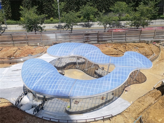 膜结构建筑排水设计依可然采用无组织排水或有组织排水方式。由于膜结构建筑的造型奇特,自由曲面,应充分考虑造型与排水的合理方式。膜结构排水坡度要求大于一般建筑。平膜坡度15%~20%以上,双曲膜脊度应大于10%。同时膜面预张力1.0~2.0kN/m以上,避免膜材在雨水作用下发生较大变形,从而在膜面产生积水、兜水。膜面积水具有马太效应特点,积水将导致局部凹陷变形,凹陷变形反过来加剧积水现象。足够坡度、曲率和张力水平是保证排水顺畅的必要条件。导水板、导水沟、落水管等膜结构设计宜与膜节点构造设计协调。